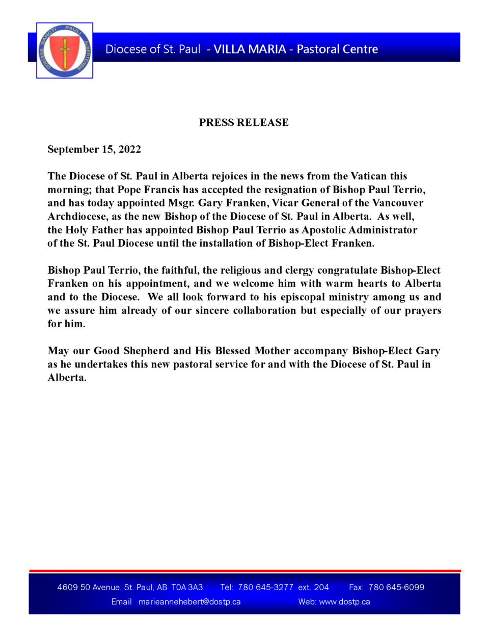 Fort McMurray Catholic Schools wishes to congratulate Bishop Paul Terrio on his retirement as well as Bishop Elect Gary Franken on his new appointment!