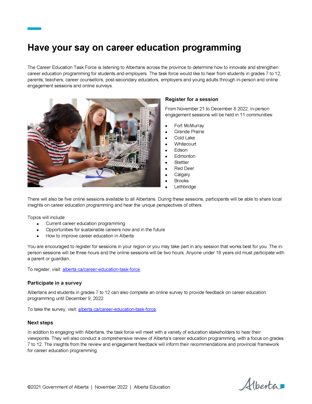 To learn more and register for the online and in person engagement sessions, and fill out a survey, please follow this link: https://www.alberta.ca/career-education-task-force.aspx